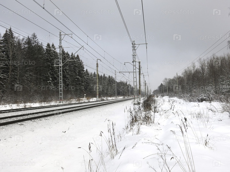 Панорама подмосковного железнодорожного полотна с вышками, проводами и рельсами зимой