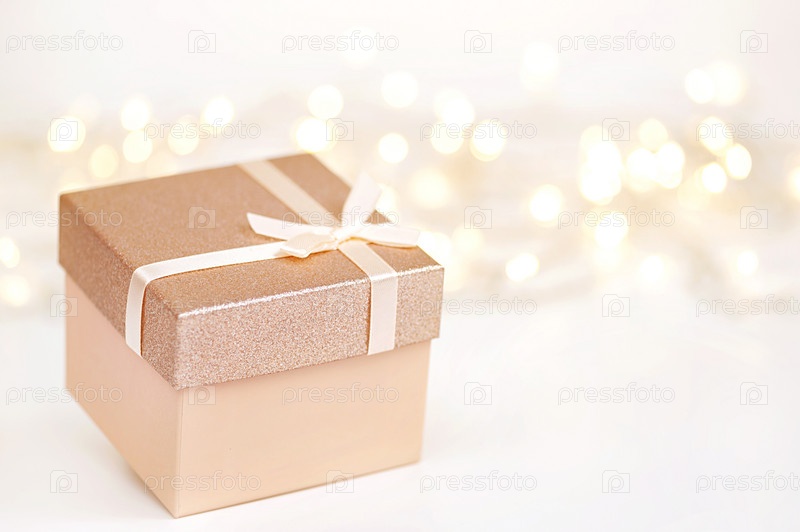 Рождество, зима, новый год. Подарочная коробка и размытые огни на заднем плане