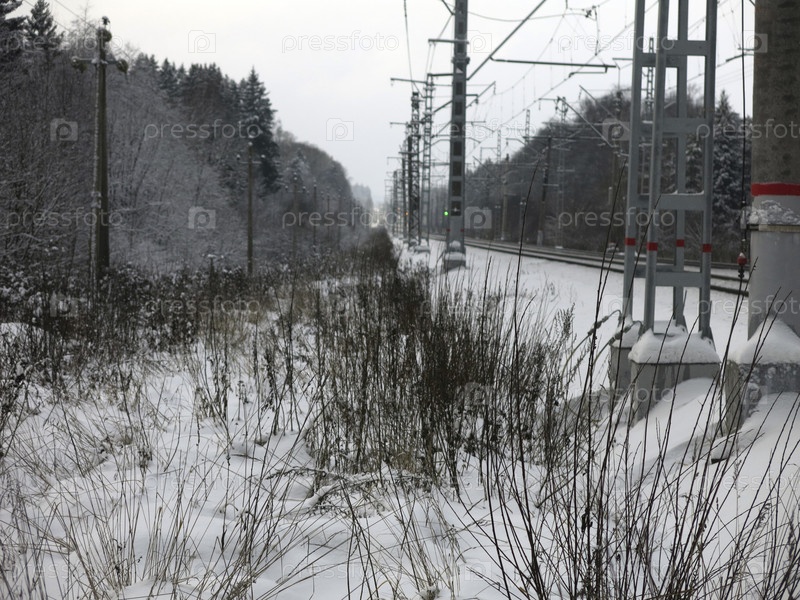 Панорама подмосковного железнодорожного полотна с вышками, проводами и рельсами зимой
