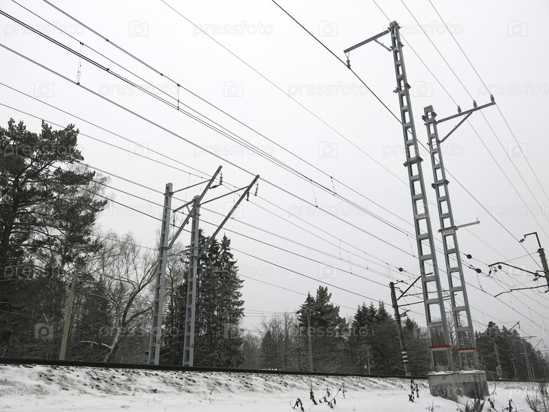 Панорама подмосковного железнодорожного полотна с вышками, проводами и рельсами зимой