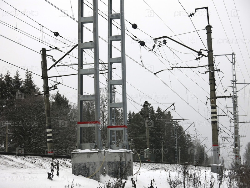 Панорама подмосковного железнодорожного полотна с вышками, проводами и рельсами зимой