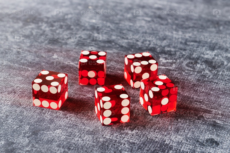 Пять красных стеклянных кубиков на сером фоне, крупный план
