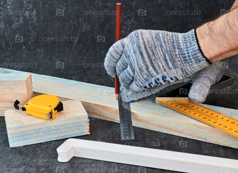 Маркировка деревянной доской карандашом и линейкой, концепция изготовления изделий из дерева и мебели