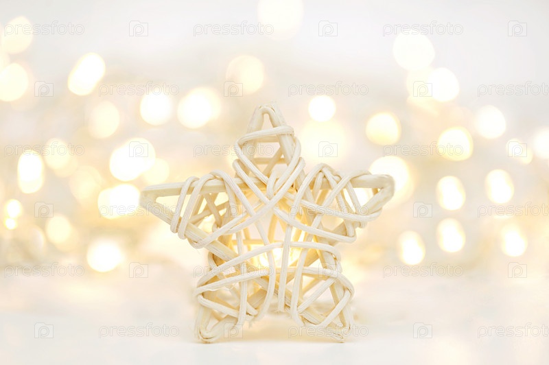 Рождественская композиция. Белая деревянная звезда и размытые огни на заднем плане