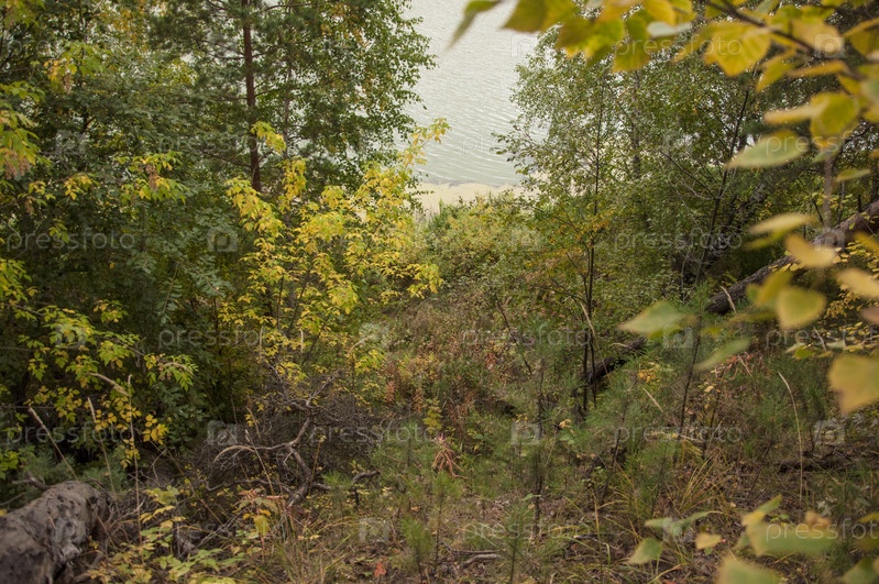 Осенняя лесная природа. Яркое утро в красочном лесу с солнечными лучами сквозь ветви деревьев. Пейзаж природы с солнечным светом