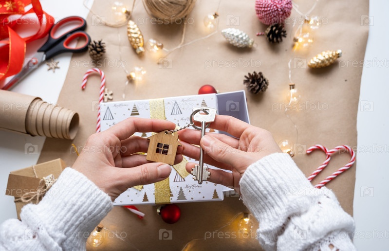 Ключ от дома с брелоком на уютном доме в подарочной коробке с упаковкой рождественского декора. Упаковать подарок на Новый год, Рождество. Строительство, проект, переезд в новый дом, ипотека, аренда, покупка недвижимости