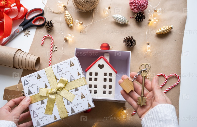 Ключ от дома с брелоком на уютном доме в подарочной коробке с упаковкой рождественского декора. Упаковать подарок на Новый год, Рождество. Строительство, проект, переезд в новый дом, ипотека, аренда, покупка недвижимости