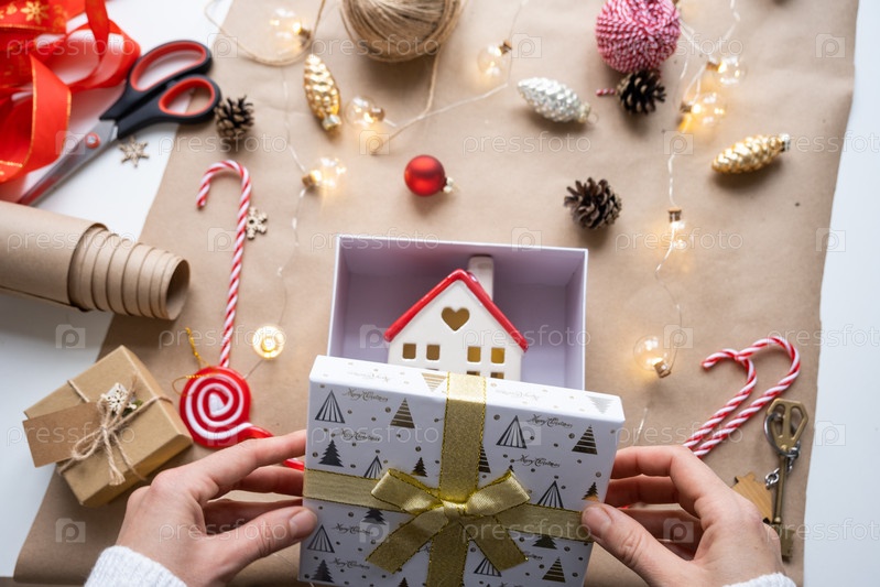 Ключ от дома с брелоком на уютном доме в подарочной коробке с упаковкой рождественского декора. Упаковать подарок на Новый год, Рождество. Строительство, проект, переезд в новый дом, ипотека, аренда, покупка недвижимости