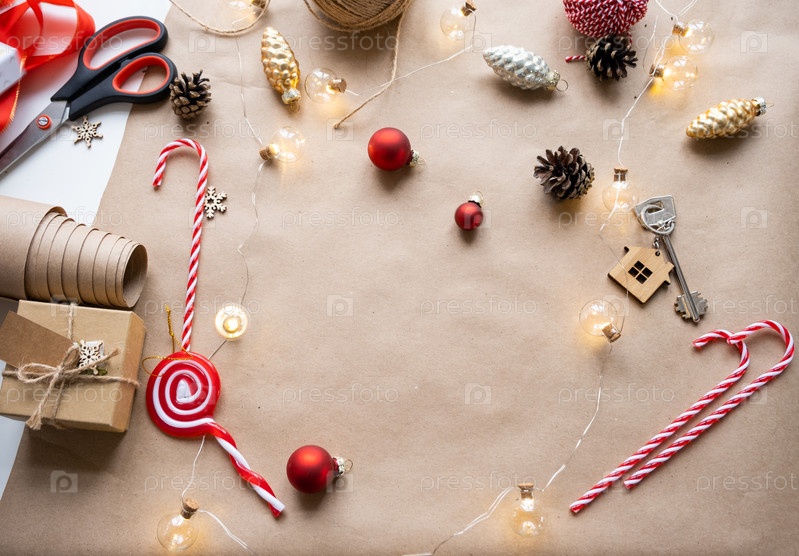 Ключ от дома с брелоком на уютном доме с рождественской раскладкой. Подарок на Новый год, Рождество. Строительство, дизайн, проект, переезд в новый дом, ипотека, аренда и покупка недвижимости