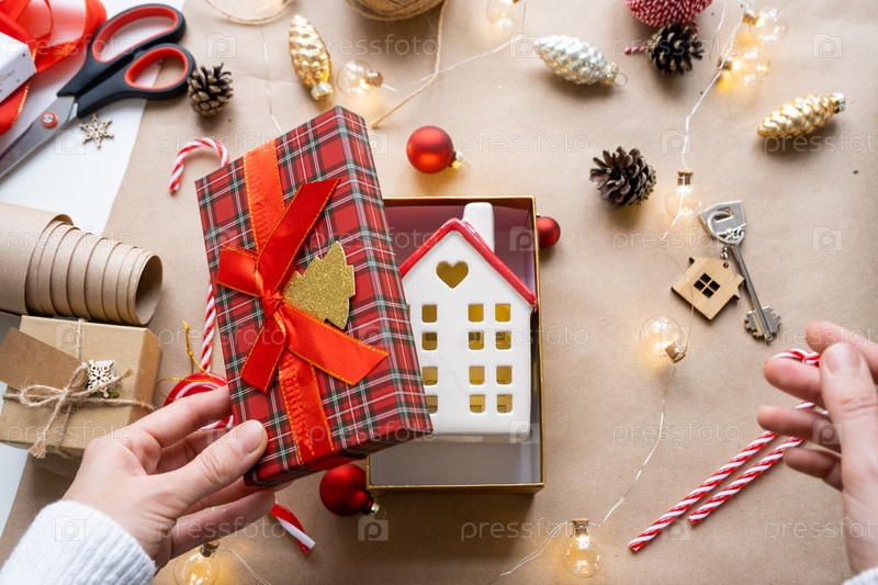 Ключ от дома с брелоком на уютном доме в подарочной коробке с упаковкой рождественского декора. Упаковать подарок на Новый год, Рождество. Строительство, проект, переезд в новый дом, ипотека, аренда, покупка недвижимости