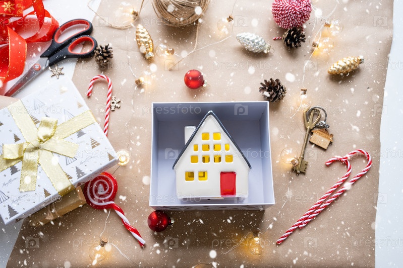 Ключ от дома с брелоком на уютном доме в подарочной коробке с упаковкой рождественского декора. Упаковать подарок на Новый год, Рождество. Строительство, проект, переезд в новый дом, ипотека, аренда, покупка недвижимости