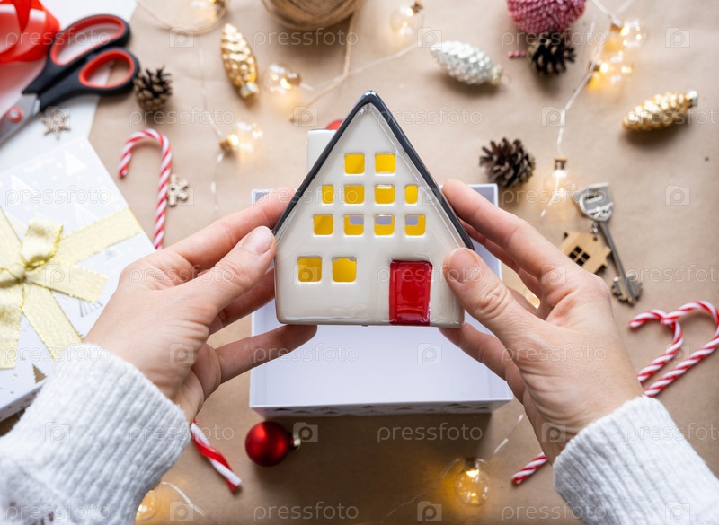 Ключ от дома с брелоком на уютном доме в подарочной коробке с упаковкой рождественского декора. Упаковать подарок на Новый год, Рождество. Строительство, проект, переезд в новый дом, ипотека, аренда, покупка недвижимости