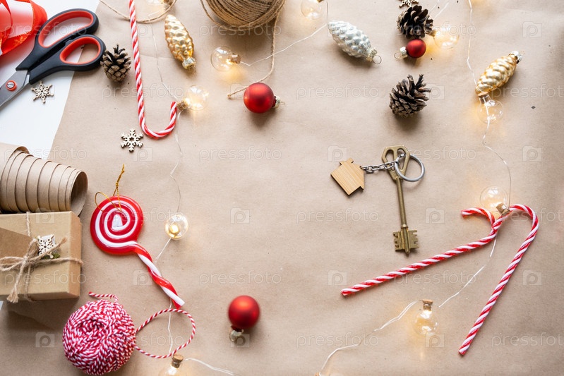 Ключ от дома с брелоком на уютном доме с рождественской раскладкой. Подарок на Новый год, Рождество. Строительство, дизайн, проект, переезд в новый дом, ипотека, аренда и покупка недвижимости