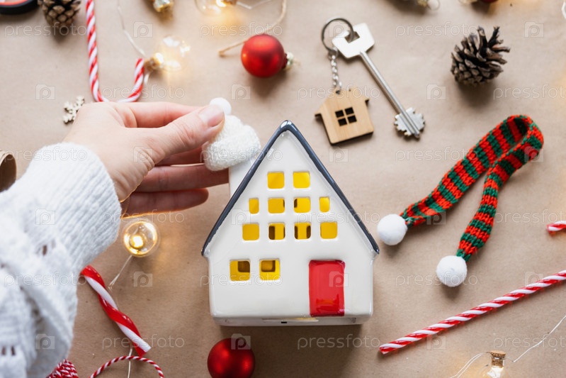 Ключ от дома с брелоком на уютном доме с рождественской раскладкой. Подарок на Новый год, Рождество. Строительство, дизайн, проект, переезд в новый дом, ипотека, аренда и покупка недвижимости