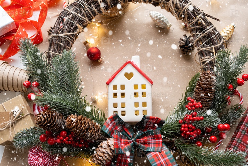 Уютный дом в рождественском декоре, теплый вязаный шарф, шапка, утепление. Зима, снег - утепление дома, защита от холода, система обогрева помещений. Праздничное настроение, Рождество, Новый год
