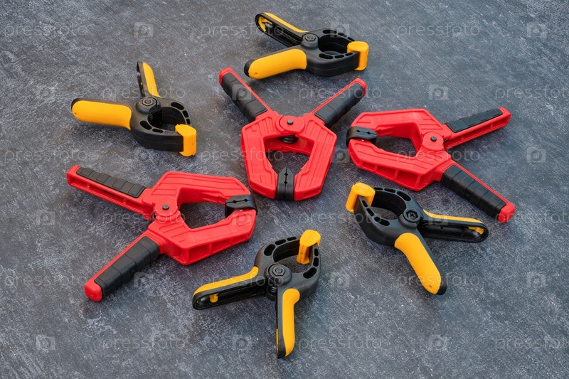 Красные и желтые пружинные зажимы. Набор малых и средних. Зажимные инструменты для столярных работ
