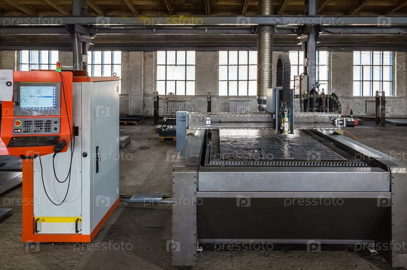 Станок лазерной резки листового металла с ЧПУ в производственной зоне. Снимок сделан в России, в цехе механического завода