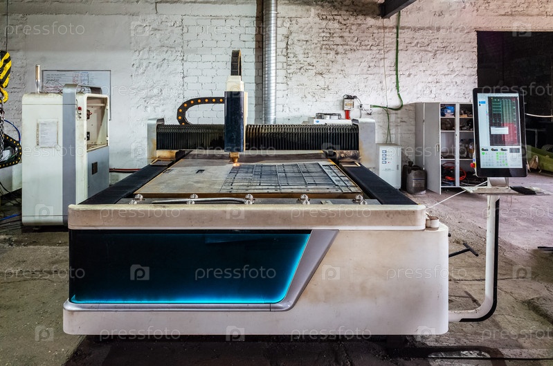 Станок лазерной резки листового металла с ЧПУ в производственной зоне. Снимок сделан в России, в цехе механического завода