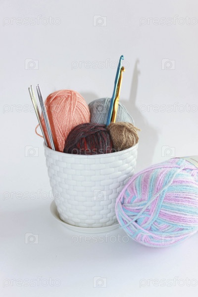 Пряжа и крючки в горшке