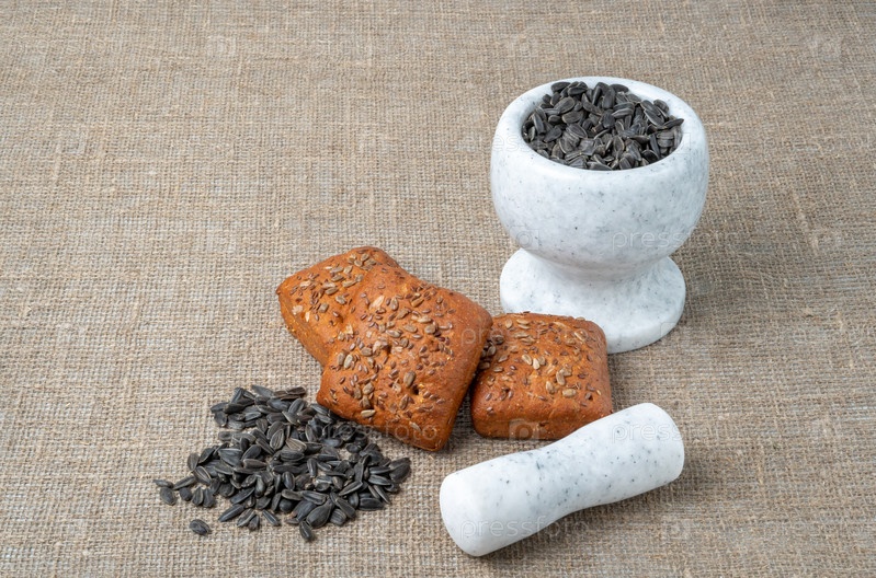 хлеб, семечки в ступке. Продукты с подсолнечными семенами