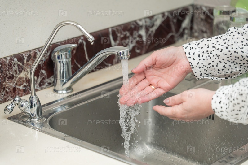 Руки трогают воду из крана на кухне