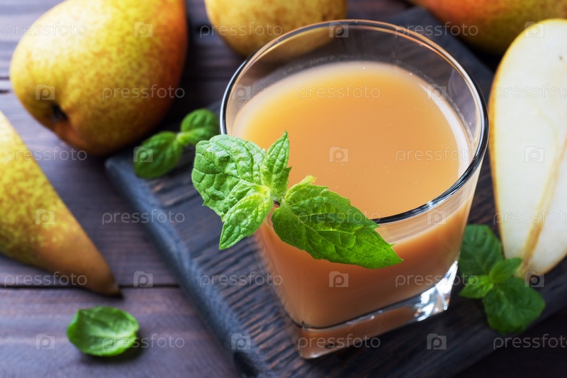 Натуральный грушевый сок в стеклянной чашке. Сочные спелые груши и листья мяты. Темный деревенский деревянный фон
