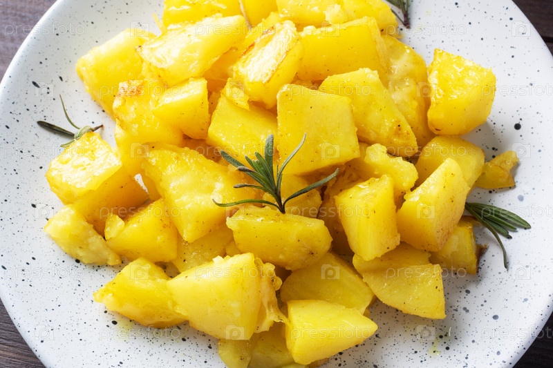 Вкусный запеченный картофель со специями, сыром и розмарином на тарелке, крупным планом