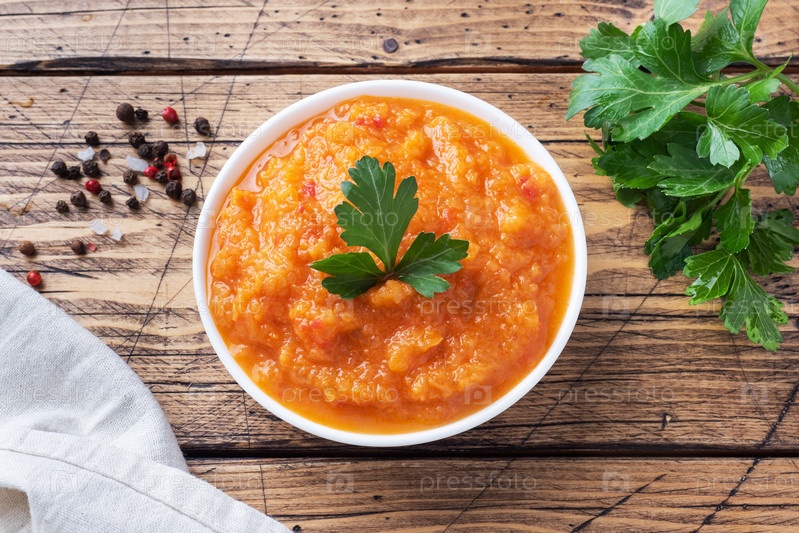 Домашняя икра из кабачков, помидоров и лука в керамической тарелке на деревянном фоне. Консервирование собственного производства, тушеные овощи