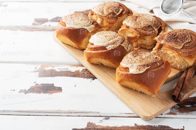 Печенье из корицы Kanelbulle с маслянистым кремом на деревенском деревянном столе