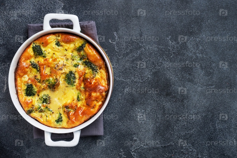Запеченный омлет с брокколи в керамической посуде. Темный бетонный стол. Скопируйте пространство. Блюдо для здорового питания