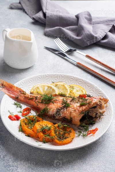 Запеченный морской окунь с томатным перцем, лимоном и травами в керамической тарелке на сером бетонном фоне. Окунь, приготовленный в духовке. Копировать пространство