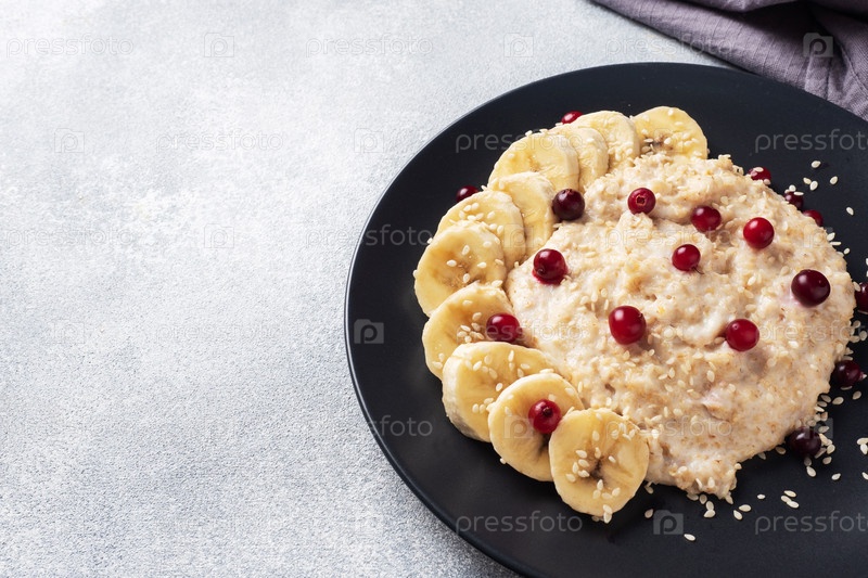 Овсянка на молоке с бананом, клюквой и кунжутом. Концепция здорового завтрака. Копировать пространство