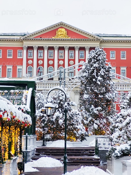 Рождественская ярмарка и украшения возле здания горсовета, мэрии Москвы. Тверская улица