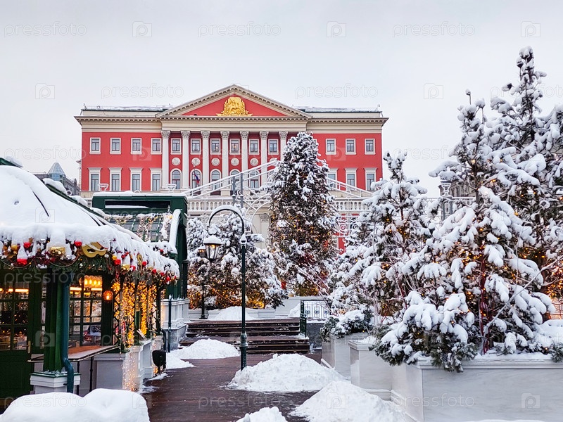 Рождественская ярмарка и украшения возле здания горсовета, мэрии Москвы. Тверская улица