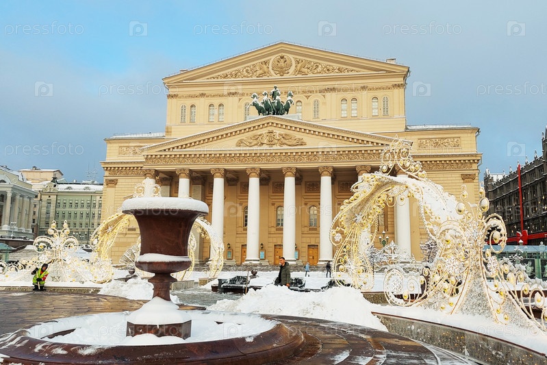 Здание Большого театра в Москве в солнечный зимний день с избирательным фокусом рождественских инсталляций