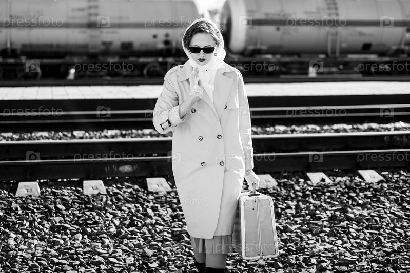 Молодая женщина в плаще и темных очках с чемоданом в руках на вокзале. Черно-белый снимок в стиле ретро на открытом воздухе