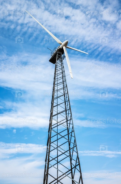 Ветряная турбина на металлической ферменной башне на фоне голубого неба с облаками. Фото сделано в России