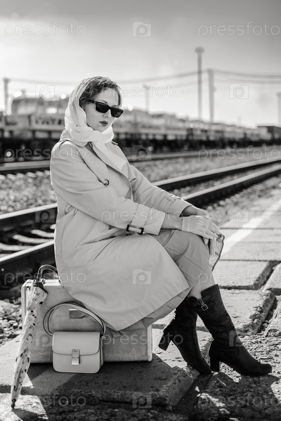 Молодая женщина в плаще и темных очках сидит на чемодане на платформе железнодорожного вокзала. Черно-белый снимок в стиле ретро на открытом воздухе