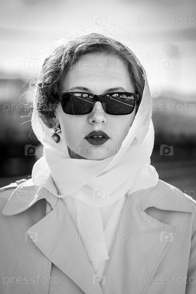 Молодая женщина в плаще и солнцезащитных очках. Черно-белый портрет в стиле ретро на открытом воздухе