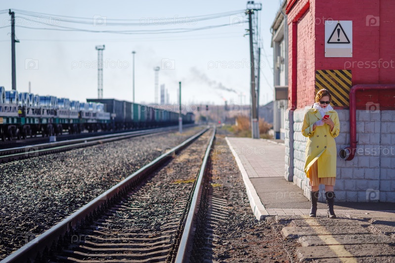 Молодая женщина в желтом плаще и темных очках с телефоном в руках на перроне вокзала. Снимок на открытом воздухе в стиле ретро