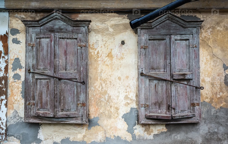 Два окна с закрытыми ставнями старого деревянного дома с потрескавшейся штукатуркой, фрагмент фасада. Россия, город Оренбург