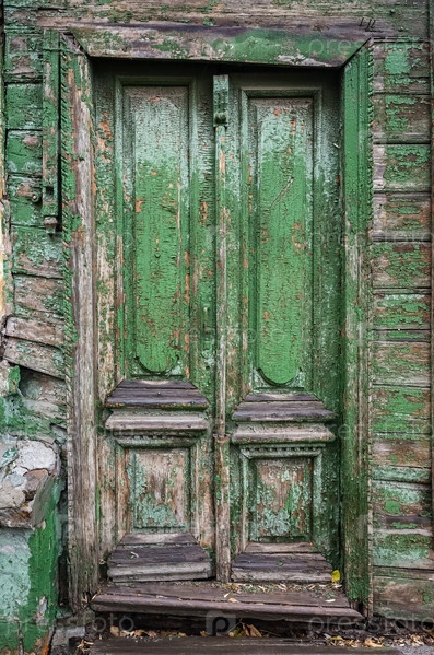 Зеленая покосившаяся дверь с облупившейся краской, старый деревянный дом, фрагмент фасада. Россия, город Оренбург
