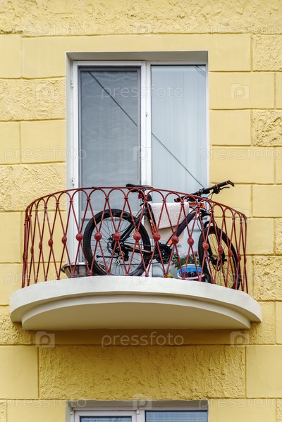 Велосипед на балконе многоэтажного дома. Снимок сделан в России, в городе Оренбург