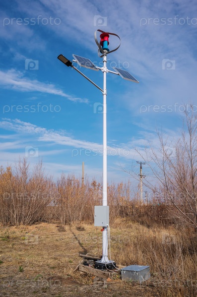 Энергонезависимый уличный фонарь с ветряной турбиной и солнечными панелями. Россия, Оренбургская область