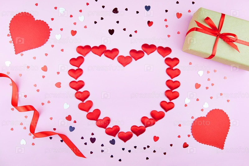 День Святого Валентина фон. Подарок, красные ленточки, декоративные сердечки, конфетти на розовом фоне