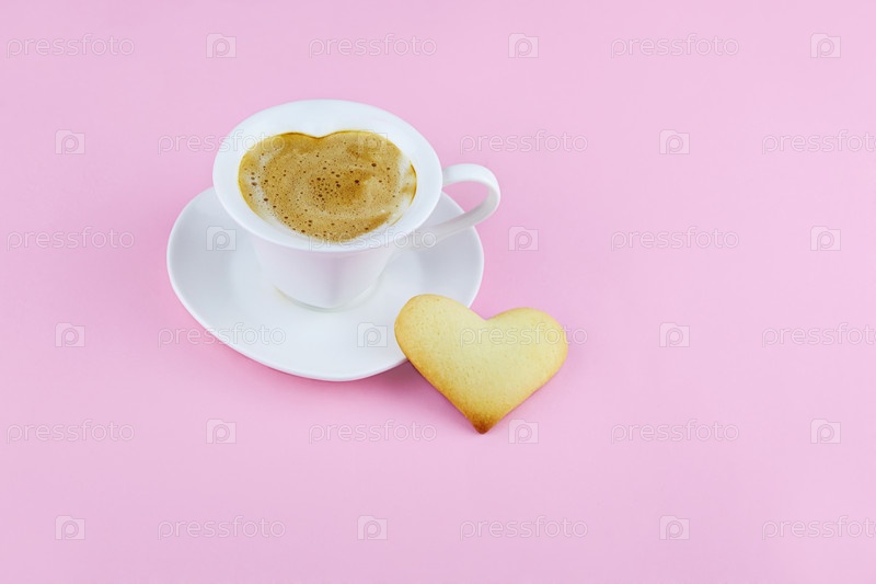 Чашка кофе и печенье в форме сердца на розовом фоне