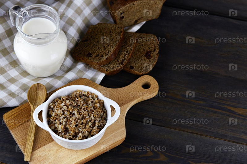 Гречневая каша в белой миске с ложкой, кувшин молока, нарезанный хлеб на темном деревянном фоне
