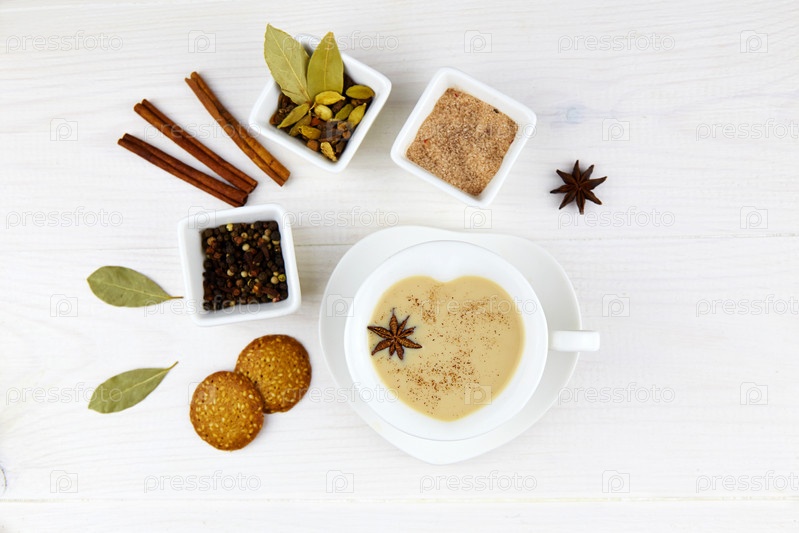 Традиционный чай масала в чашке с ингредиентами для приготовления чая на белом деревянном фоне. Вид сверху