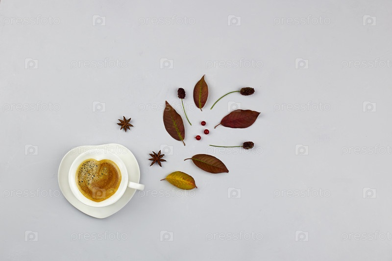 Чашка кофе с молоком, осенние листья на сером фоне. Осенняя композиция. Плоская планировка, вид сверху
