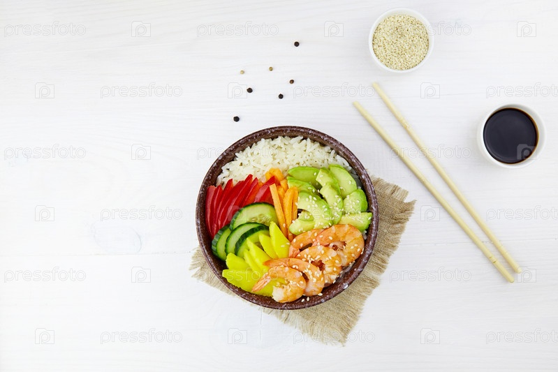 Чаша с креветками, рисом, авокадо, огурцом, манго, перцем и семенами кунжута. Гавайская диетическая еда. Вид сверху. Плоская планировка